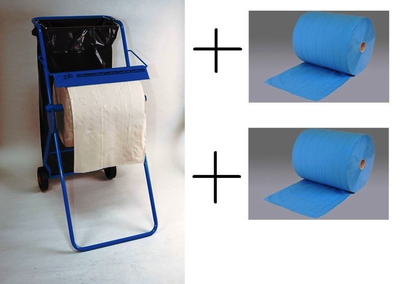 Putztuchrolle blau 3-lagig mit Punkt-zu-Punkt Prägung + Bodenständer mit Müllsackhalterung